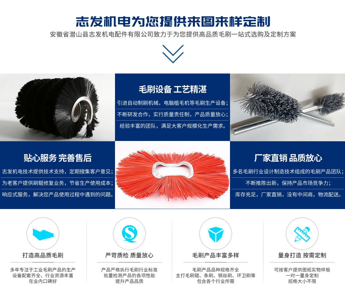 安徽省潛山縣志發機電配件有限公司是一家大型毛刷生產廠家,公司生產各類管道刷、掃路刷、毛刷輥、條刷、圓盤刷、鋼絲刷、環衛刷、彈簧刷、橡膠輥、毛刷輪、試管刷等毛刷產品。 志發機電注重企業文化建設,堅持以人為本、以文化興司,大力培育和弘揚“團結、忠誠、務實、創新”的企業精神、“鑄就品質創新決定未來”的企業理念,秉承“從毫厘做起,不留任何遺憾”的質量觀念,堅持自主創新,將公司發展成為潛山毛刷基地品質生產商...